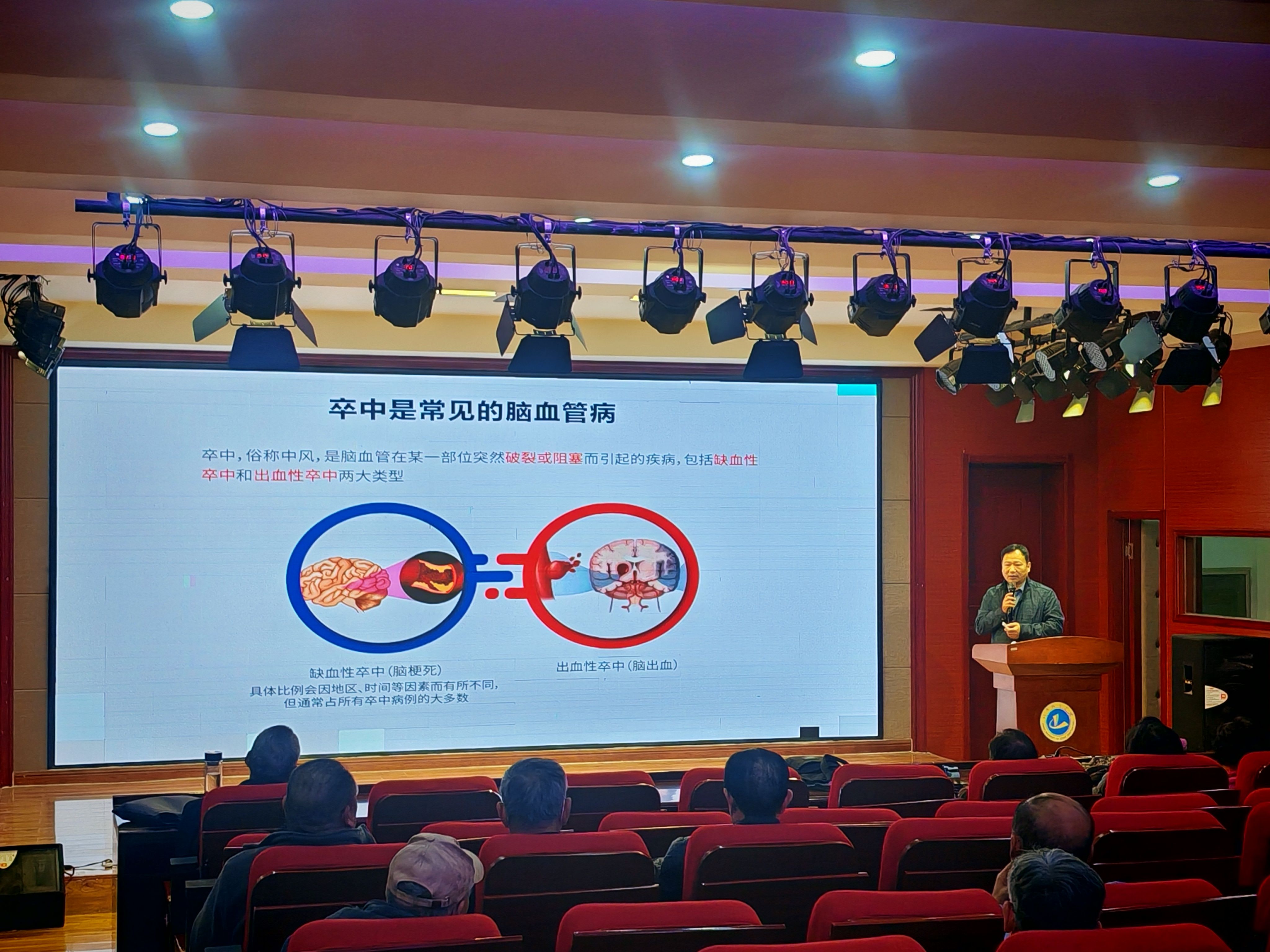 为切实守护退休职工身体健康,提升老年群体对急性脑血管病的科学认知与应急处置能力,11月19日下午,退休职工工作处、校医院联合989医院,在我校举办“急性脑血管病预防、识别与治疗”专题健康讲座。本次讲座特邀989医院急诊内科主任付徐伟主讲,近50名退休职工到场参与,现场学习氛围热烈。